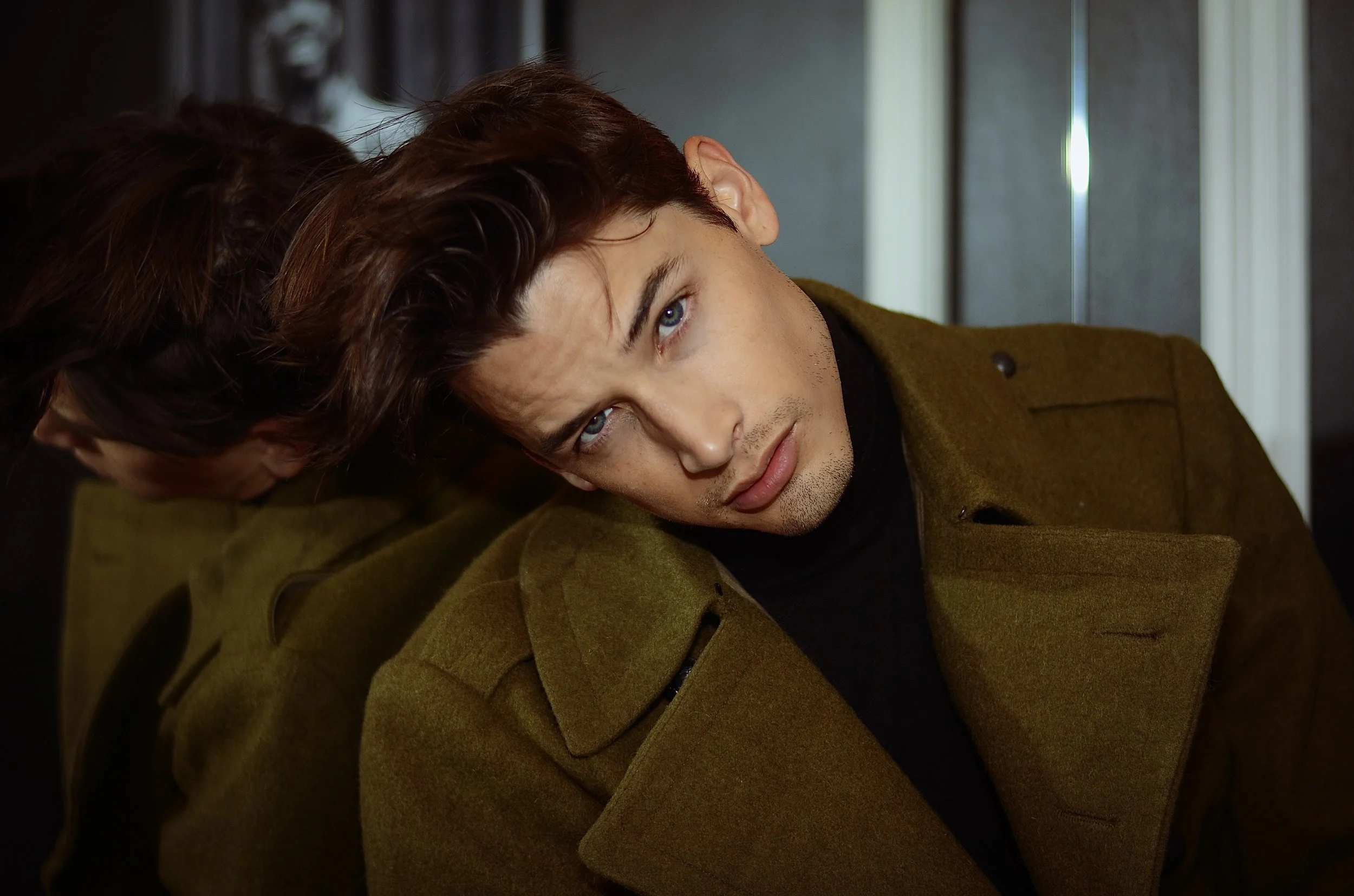 A young man with blue eyes and dark hair, resting his head on a reflective surface, wearing a brown coat and a black turtleneck, in a dimly lit room.